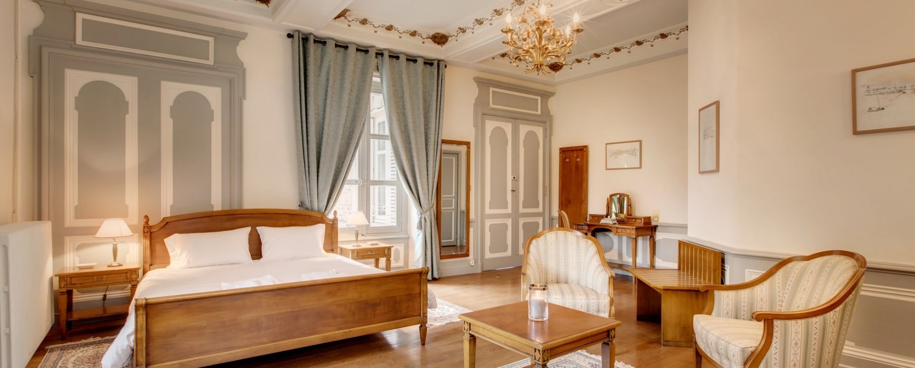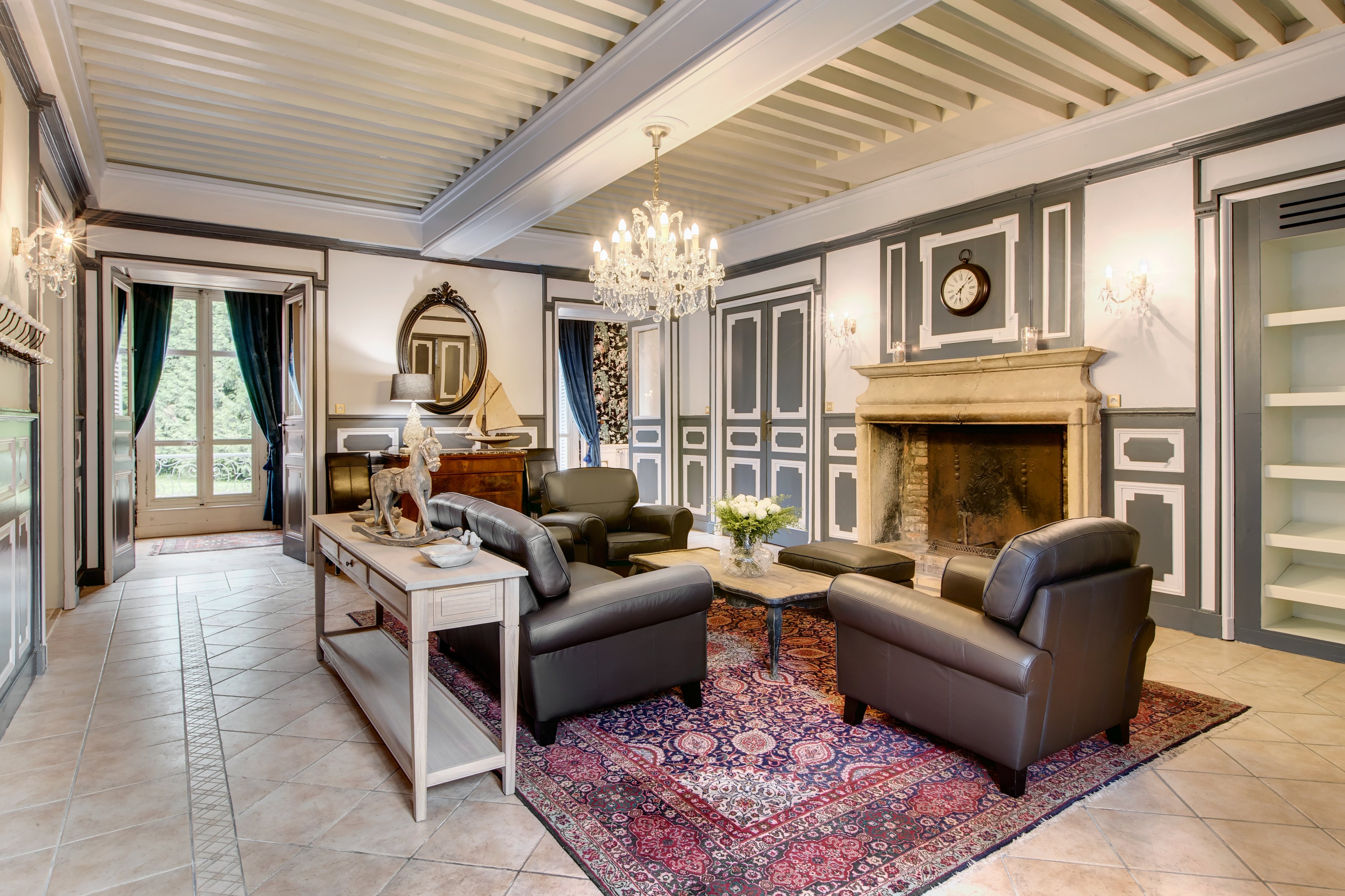 Le grand salon est situé au 1er étage. Il est très lumineux, avec une immense hauteur sous plafond et de grandes fenêtres ouvrant sur le parc, donc une avec balcon. Les plafonds en staff, les boiseries, l'immense cheminée et son miroir, ainsi que le parquet chêne d'époque apportent une touche d'authenticité digne de votre séjour de châtelain.